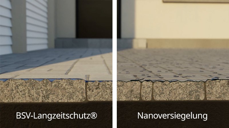 Im Gegensatz zu einer gewöhnlichen Imprägnierung, die nach spätestens 1–2 Jahren erneuert werden sollte, hält der BSV-Langzeitschutz® viele Jahre und erspart Ihnen dadurch Zeit, Geld und Mühe. Einmal professionell aufgetragen, bleibt Ihre Terrasse oder Einfahrt dauerhaft gepflegt – so können Sie sich über Jahre hinweg an einem nahezu neuwertigen Außenbereich erfreuen, ganz ohne regelmäßiges Schrubben.